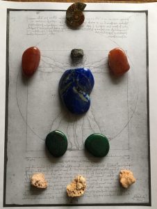 The base is not actually a grid, but Da Vinci’s Vitruvian Man. The image is in the public domain and is available on Wikipedia at https://en.wikipedia.org/wiki/Leonardo_da_Vinci#/media/File:Da_Vinci_Vitruve_Luc_Viatour.jpg or print out the PDF below. This energy grid does have a masculine aspect about it, and the original recipient was indeed a man. Place the stones in the order given.