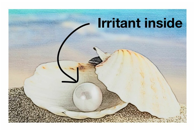 “Pearls are formed inside the shell of certain mollusks as a defense mechanism against a potentially threatening irritant such as a parasite inside the shell, or an attack from outside, injuring the mantle tissue. The mollusk creates a pearl sac to seal off the irritation. Pearls are commonly viewed by scientists as a by-product of an adaptive immune system-like function.” (wikipedia.org) Genius. This same idea can be applied to all those irritants (traffic, people, co-workers, family, etc.) that come at us in everyday life. When an irritant comes along, you must pearl it. Enclose it with that ephemeral ether that you can magically conjure. Coat the irritant again and again until it is shiny and incapable of irritating you again. What once was only an irritant to you is now something very valuable. Since you have projected something valuable into the universe, something of value will come back to you. AND no karmic repercussions will be returned to you. Next time you are dealing with an irritant, pearl it.